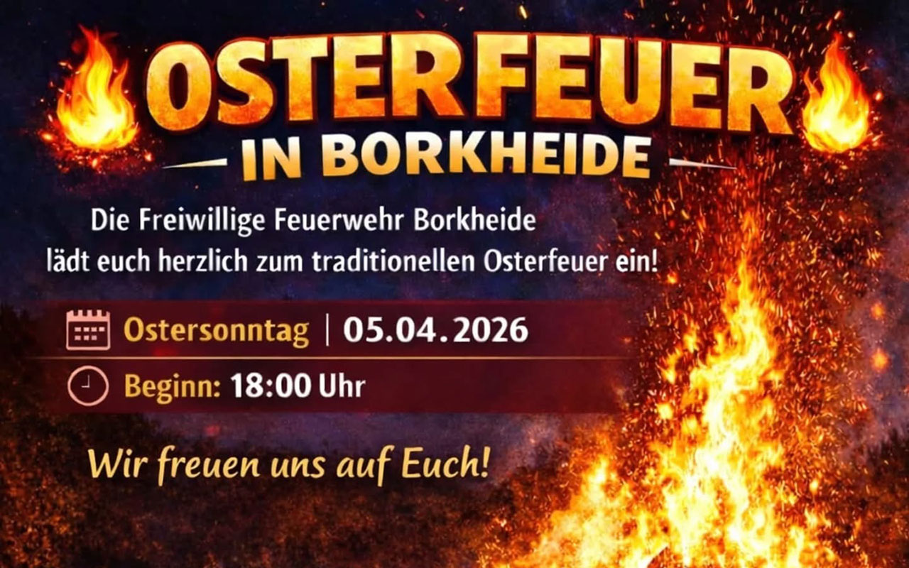 Die Freiwillige Feuerwehr Borkheide lädt euch herzlich zum diesjährigen Osterfeuer ein. Kommt vorbei und genießt den schönen Abend mit uns gemeinsam. Für das leibliche Wohl ist wie alle Jahre wieder gesorgt. Wir freuen uns auf Euch! Eure Freiwillige Feuerwehr Borkheide