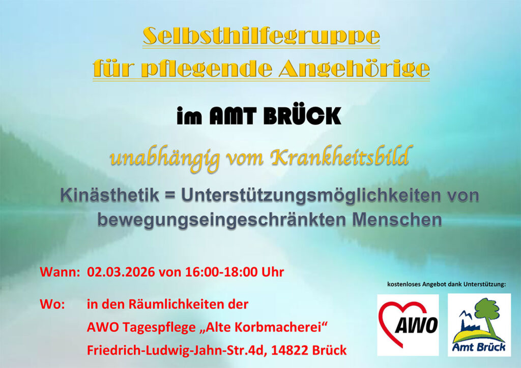 Alle pflegenden Angehörigen aus dem gesamten Amtsgebiet sind am 02.03.2026 ab 16.00 Uhr wieder recht herzlich in die AWO-Tagespflege Brück zur Selbsthilfegruppe (unabhängig vom Krankheitsbild)eingeladen. Diesmal werden die 6 Konzepte der Kinästhetik vorgestellt, welche die Möglichkeit bieten, bewegungseingeschränkten Menschen besser beim Aufstehen, Umsetzen etc. zu unterstützen.